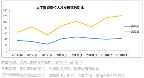 2018年,国内AI人才需求爆发式增长主要体现在深度学习、算法工程师等高层级岗位上,基础通用岗位的需求则相对稳定。