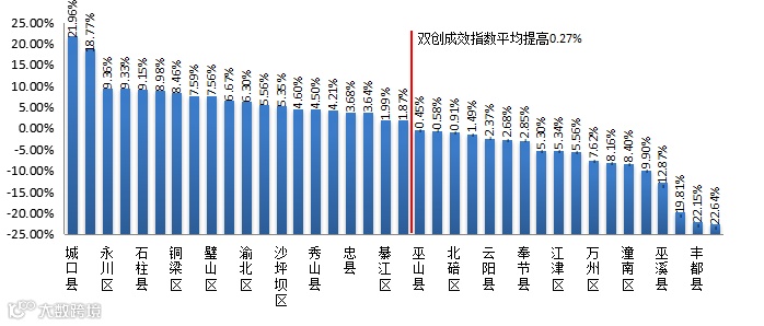从连续两个季度双创成效指数提高的百分点来看,38个区县平均提高0.27%,全市双创成效指数呈增长趋势,其中有20个区县的双创成效指数增长幅度高于平均分。从全市来看,双创成效指数增幅较大的有:城口县、大足区、永川区、渝中区、石柱县、巴南区、铜梁区,其中城口县增幅最大,双创成效指数增幅为21.96%,其增长幅度较大的指标为就业潜力,指数值较2018年第3季度增长了47.90%;双创成效指数降幅较大的有:彭水县、巫溪县、涪陵区、丰都县、梁平区,其中梁平区降幅最大,双创成效指数降幅为22.64%,其降低幅度较大的指标为就业潜力,指数值较2018年第3季度降低了41.27%。