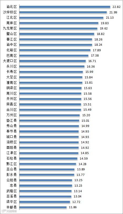 从全市总体比较情况来看,2018年第4季度,渝北区、沙坪坝区、江北区、南岸区、九龙坡区的双创成效显著,其中,双创成效指数最高的为渝北区,指数值为22.82;云阳县、忠县、武隆区、巫溪县、梁平区、丰都县的双创成效较低,其中,丰都县的双创成效指数值最低,为11.86。