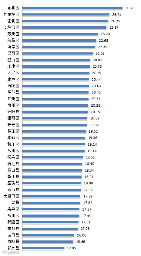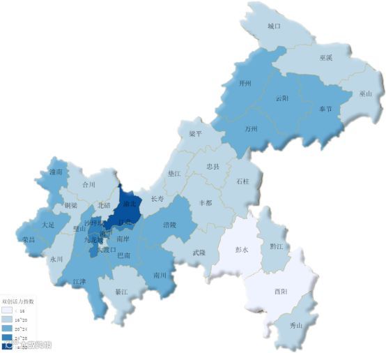 从全市总体比较情况来看,2018年第4季度,渝北区、九龙坡区、江北区、沙坪坝区的双创活力突出,其中,双创活力指数最高的为渝北区,指数值为30.78;武隆区、丰都县、城口县、酉阳县、彭水县在双创活力方面的表现偏弱,其中,彭水县的双创活力指数值最低,为12.85。