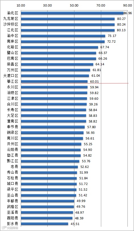 第三类:双创指数得分在50—70分的区县有27个,分别为:北碚区、璧山区、巴南区、荣昌区、万州区、大渡口区、綦江区、永川区、涪陵区、江津区、合川区、长寿区、大足区、潼南区、奉节县、铜梁区、南川区、开州区、云阳县、垫江县、黔江区、忠县、秀山县、石柱县、城口县、梁平区、巫山县。
