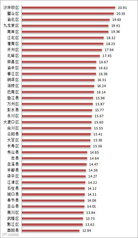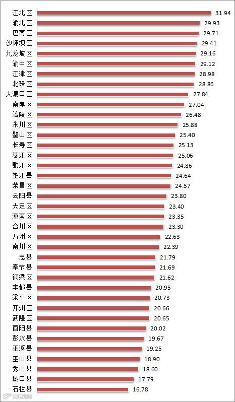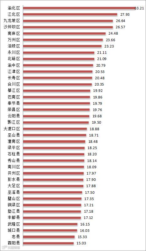 从全市总体比较情况来看,2019年第1季度,渝北区、江北区、九龙坡区、沙坪坝区的双创活力突出,其中,双创活力指数最高的为渝北区,指数值为33.21;丰都县、武隆区、城口县、忠县和酉阳县在双创活力方面的表现偏弱,其中,酉阳县的双创活力指数值最低,为15.03。