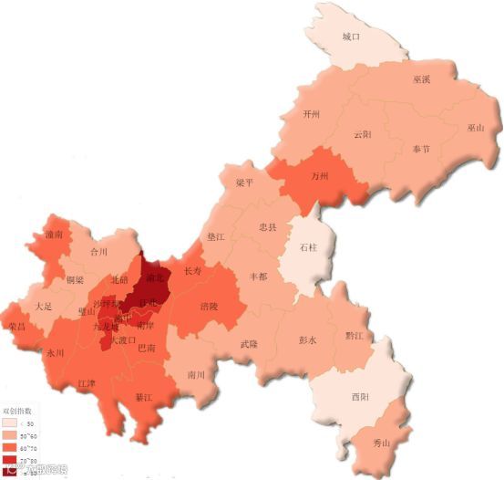 第二类:双创指数得分在70—80分的区县有4个,为江北区、沙坪坝区、九龙坡区、南岸区。