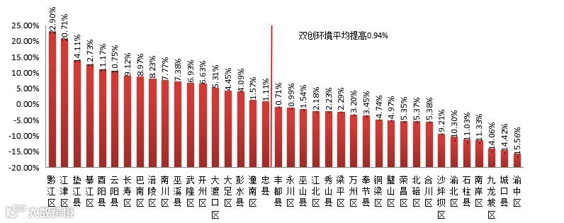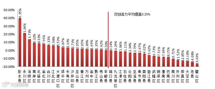 从连续两个季度双创活力指数提高的百分点来看,38个区县平均增长了0.25%,由于部分区县双创活力指数降幅较大,导致全市双创活力指数整体上升不明显,其中有19个区县的双创活力指数上升幅度高于平均分。从全市来看,双创活力指数增幅较大的有:彭水县、永川区、涪陵区、南岸区、北碚区、渝北区,其中彭水县增幅最大,双创活力指数增幅为39.35%;双创活力指数降幅较大的有:酉阳县、丰都县、城口县、大渡口区、彭水县、永川区,其中璧山区降幅最大,双创活力指数降幅为16.63%。