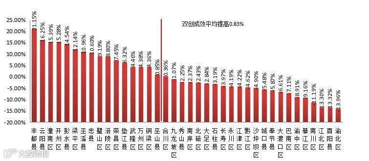 从连续两个季度双创成效指数提高的百分点来看,38个区县平均提高0.83%,全市双创成效指数呈增长趋势,其中有16个区县的双创成效指数增长幅度高于平均分。从全市来看,双创成效指数增幅较大的有:丰都县、云阳县、潼南区、开州区、彭水县、梁平区、巫溪县,其中丰都县增幅最大,双创成效指数增幅为21.15%,其增长幅度较大的指标为就业潜力,指数值较2018年第4季度增长了56.07%;双创成效指数降幅较大的有:綦江区、南川区、江北区、酉阳县、渝北区,其中渝北区降幅最大,双创成效指数降幅为13.96%,其降低幅度较大的指标为就业潜力,指数值较2018年第4季度降低了20.66%。