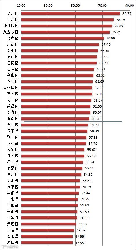 第一类:双创指数得分在80分以上的区县有1个,为渝北区。