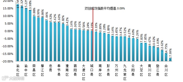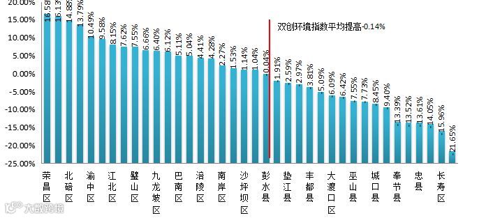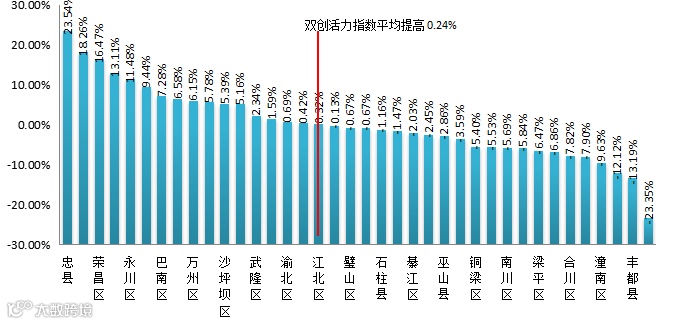 从连续两个季度双创活力指数提高的百分点来看,38个区县平均增长了0.24%,全市双创活力指数整体有所上升,其中有17个区县的双创活力指数上升幅度高于平均分。从全市来看,双创活力指数增幅较大的有:忠县、秀山县、荣昌区、开州区、永川区,其中忠县增幅最大,双创活力指数增幅为23.54%;双创活力指数降幅较大的有:城口县、潼南区、黔江区、丰都县、大渡口区,其中大渡口区降幅最大,双创活力指数降幅为23.35%。