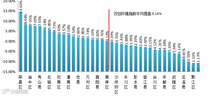 从连续两个季度双创环境指数提高的百分点来看,38个区县平均下降了0.14%,全市双创环境指数呈下降趋势,其中有20个区县的双创环境指数呈正增长。从全市来看,双创环境指数增幅较大的有:荣昌区、潼南区、北碚区、开州区、渝中区,其中荣昌区增幅最大,双创环境指数增幅为16.58%,其增幅较大的指标为社会关注度,指数值较2018年第1季度增长了38.36%;双创环境指数降幅较大的有:永川区、忠县、巫溪县、长寿区、武隆区,其中武隆区降幅最大,双创环境指数降幅为21.65%,其降低幅度较大的指标为社会关注度,指数值较2018年第1季度降低了37.17%。