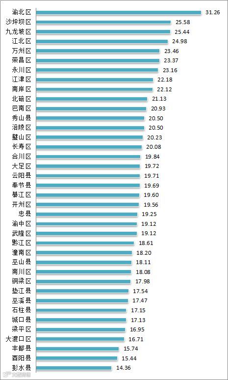 从全市总体比较情况来看,2018年第2季度,渝北区、沙坪坝区、九龙坡区、江北区、万州区的双创活力突出,其中,双创活力指数最高的为渝北区,指数值为31.26;梁平区、大渡口区、丰都县、酉阳县、彭水县在双创活力方面的表现偏弱,其中,彭水县的双创活力指数值最低,为14.36。