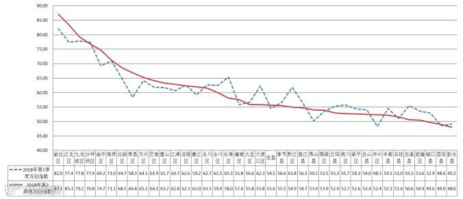 相比2018年第1季度,2018年第2季度全市38个区县的双创指数得分有所下降,平均下降了0.14%,其中有19个区县的双创指数得分较上季度有所提升。2018年,渝北区双创指数得分在全市排名第一,得分有所上升,从2018年第1季度的82.06分上升到87.13分。双创指数得分增幅较大的区县分别有:荣昌区、开州区、渝中区、江北区、秀山县、渝北区、北碚区、綦江区,其中荣昌区增幅最大,增加了8.51分,增长幅度达到14.6%;双创指数得分降幅明显的区县分别有:丰都县、南川区、武隆区、城口县、巫溪县、大渡口区、黔江区、长寿区,其中长寿区降幅最大,降低了7.27分,降幅为11.13%。