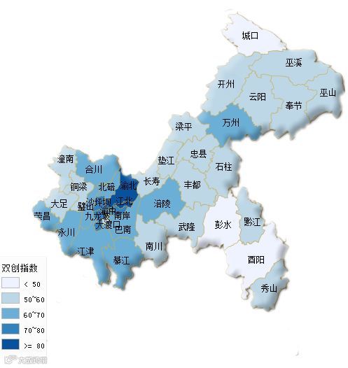 第四类:双创指数得分在50分以下的区县有3个,分别为:城口县、酉阳县、彭水县。