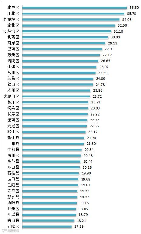 从全市总体比较情况来看,2018年第2季度,渝中区、江北区、九龙坡区、渝北区、沙坪坝区的双创环境相对优良,其中,双创环境指数最高的为渝中区,指数值为36.60;酉阳县、开州区、巫溪县、秀山县、武隆区的双创环境有待改善,其中,武隆区的双创环境指数值最低,为17.29。
