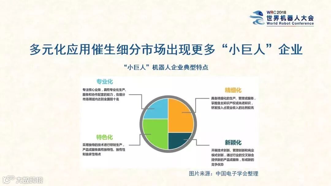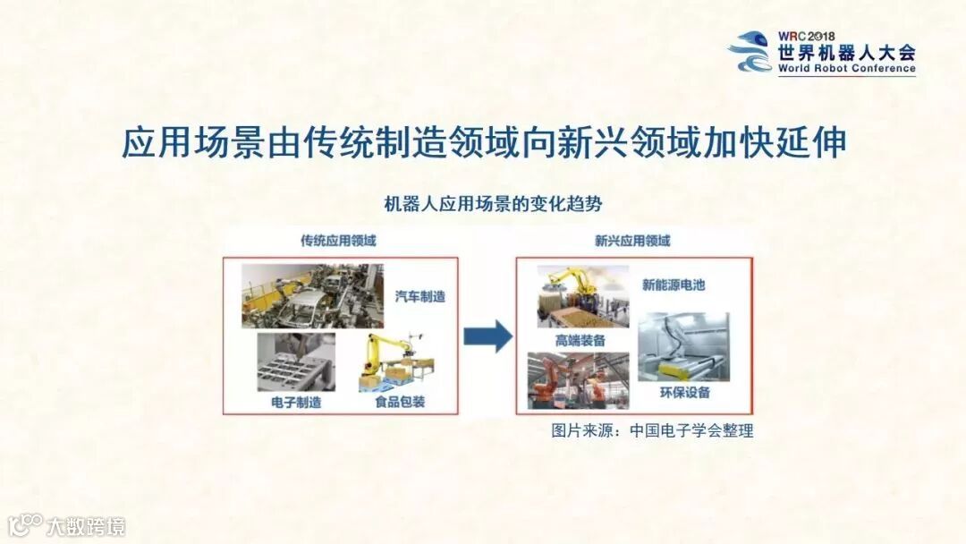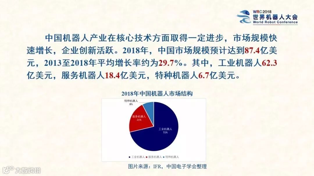 该报告预测,2018年我国机器人市场规模将达87.4亿美元。其中,工业机器人62.3亿美元、服务机器人18.4亿美元、特种机器人6.7亿美元。2013年到2018年,我国机器人市场的平均增长率将达29.7%。