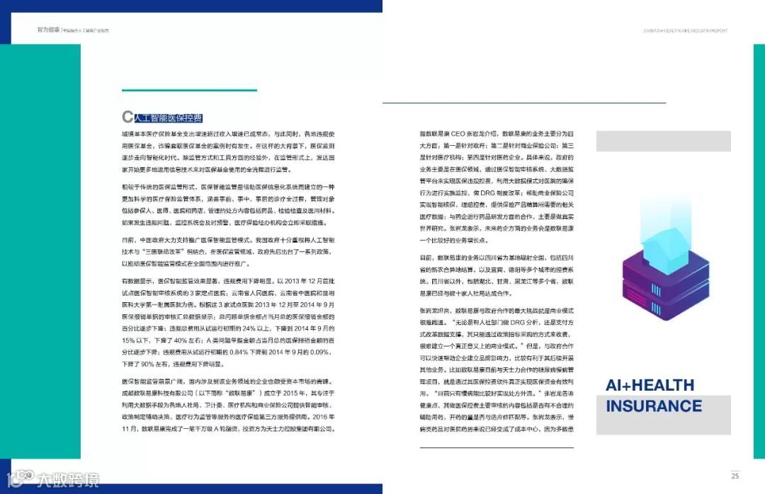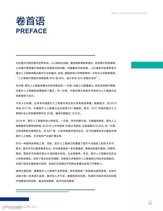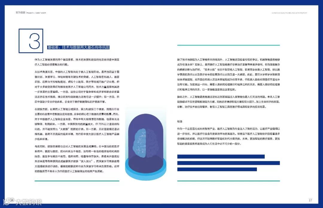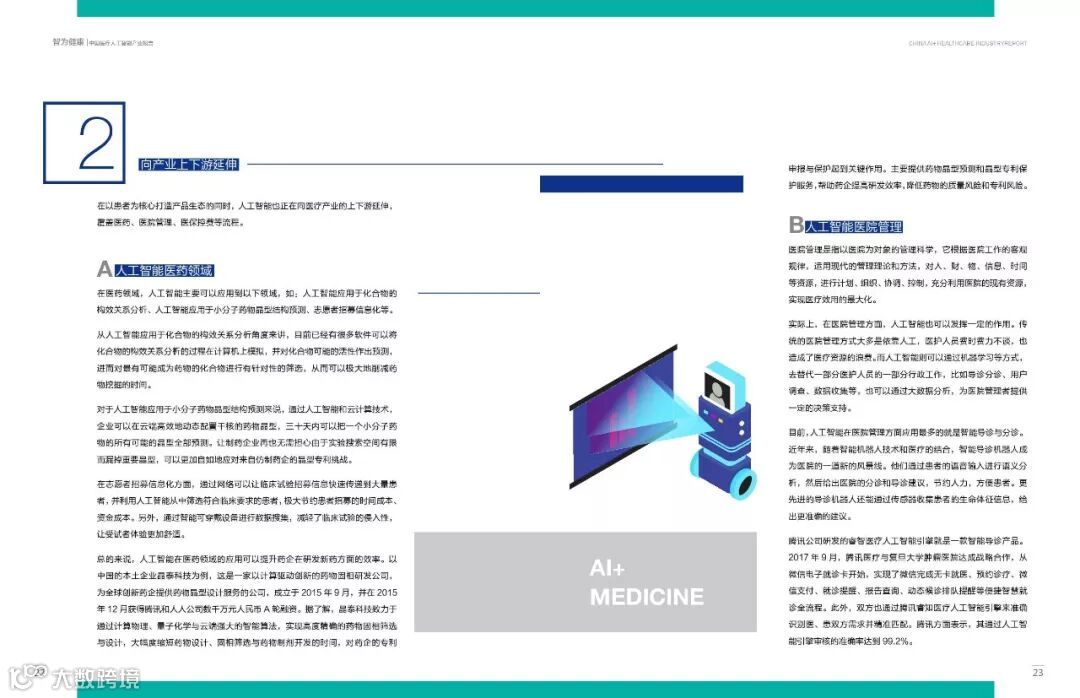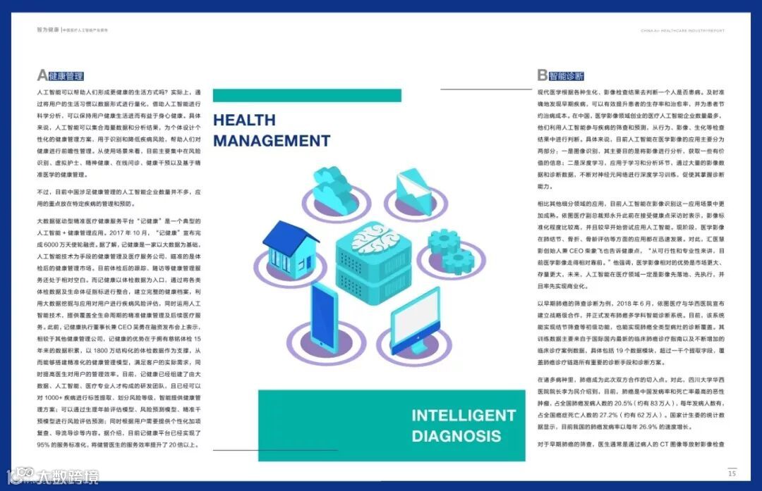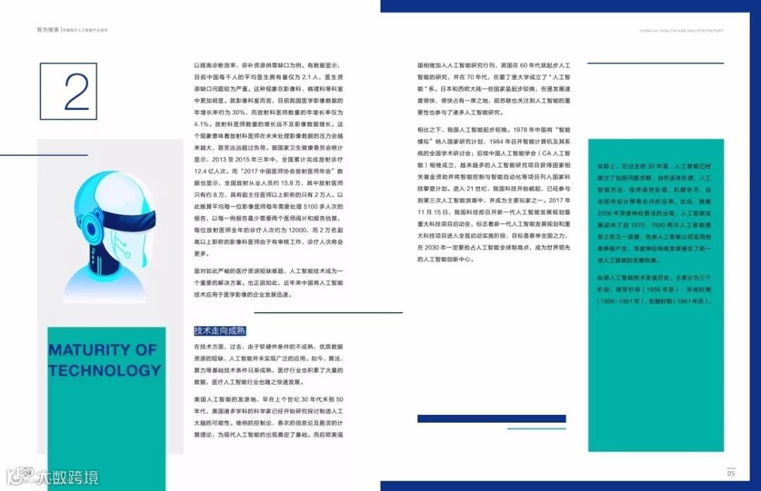 《报告》在梳理当下医疗人工智能产业现状的同时,调研了国内数十家医疗人工智能企业,一方面对典型企业进行深入分析,另一方面通过综合研究预判行业最新发展趋势。财新健康点运营总监赵国闯认为,医疗人工智能在中国有着先天发展优势:一方面,中国人口数量庞大,有充足的医疗数据,为医疗人工智能发展提供了基石;另一方面,中国足够大的医疗市场也为人工智能企业提供了动力。