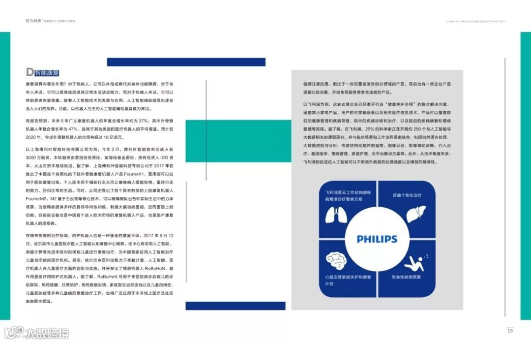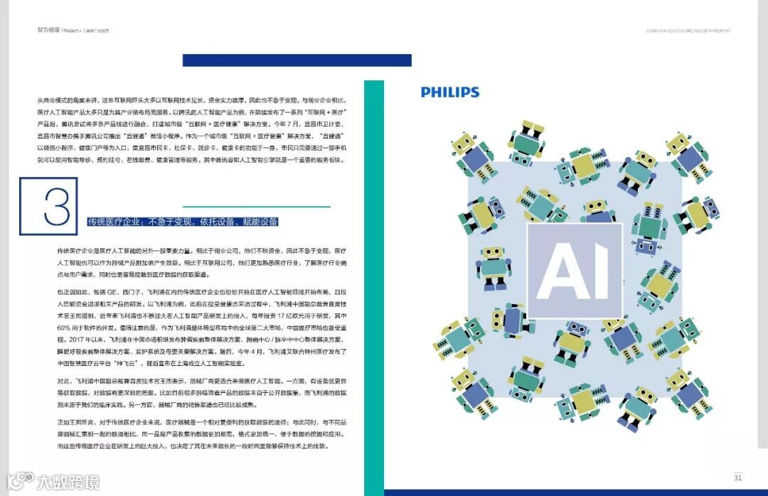 “无论是在国内还是国际上,医疗人工智能都在以惊人的速度发展着。”日前,由财新健康点与飞利浦公司联合发布的《中国医疗人工智能产业报告》(以下简称《报告》)指出,近年来,中国医疗市场上涌现出了大量医疗人工智能创业公司,与此同时,不少传统医疗相关企业和互联网平台也在纷纷引入人工智能人才与技术,进行相关布局。在信息技术快速发展的同时,人工智能也在推动医疗健康行业的变革发展。