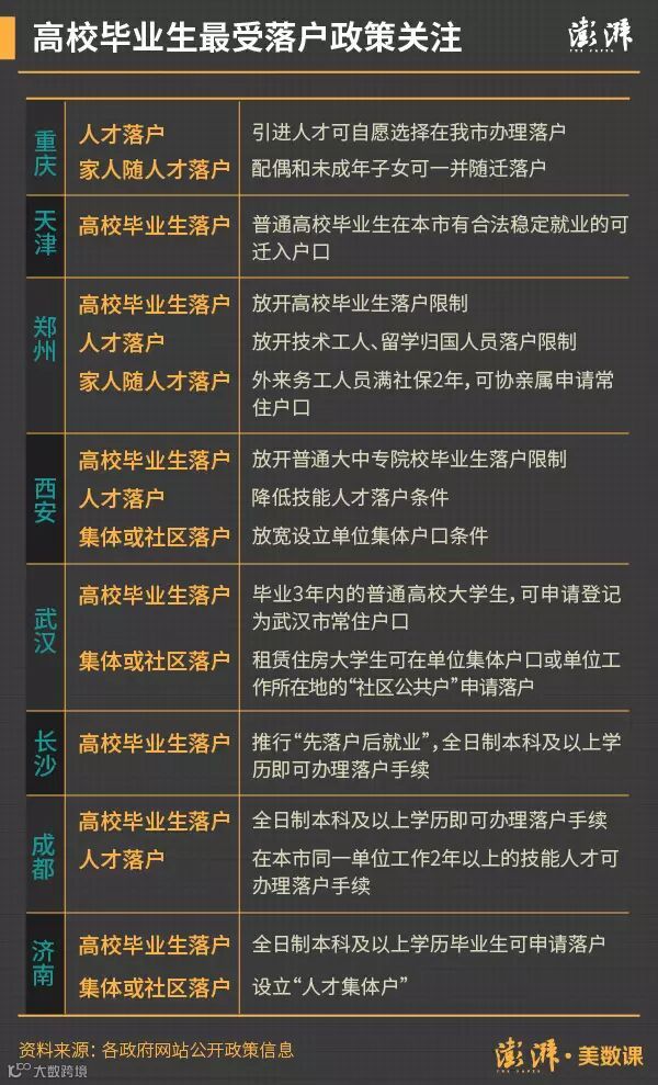 长沙和成都在高校毕业生的落户政策上取消了毕业年限的要求,提出了毕业即可落户的政策,更首先明确提出“先落户后就业”的概念,全日制本科毕业生只需凭有效证件即可办理落户手续。