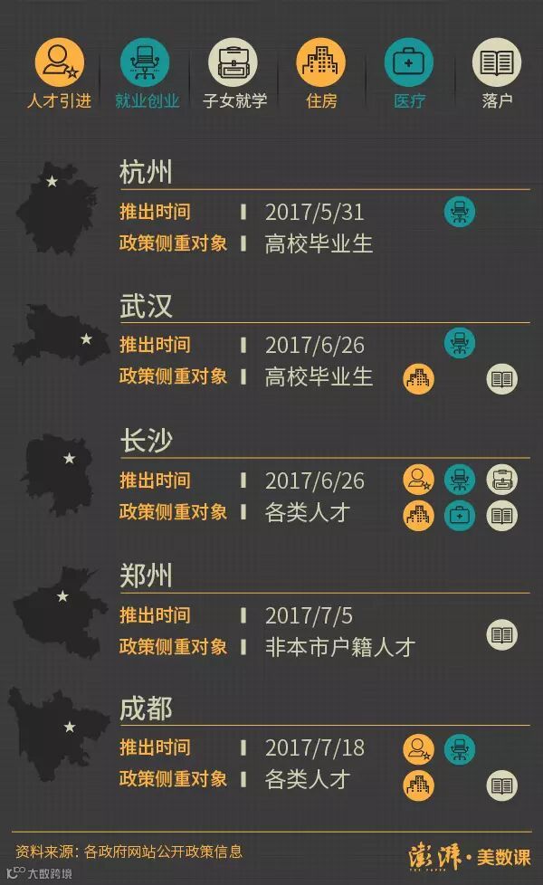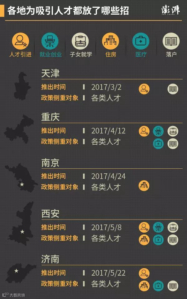 近期各地频频出台“人才新政”,一场人才争夺战正在上演。从人才引进、就业创业、落户、住房、医疗和子女就学六个维度,梳理了10座城市各自出台的人才政策。