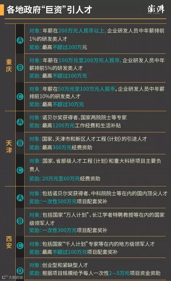 但由于政府对顶尖人才的评判门槛较高,想拿到补助并不容易。各地对于人才的划分标准存在差异:大部分城市按国家级、省级、市级等进行划分,“比拼”意味浓厚。例如天津市对诺奖级别人才开出了最高1200万元的补贴,而西安对同水平人才的补贴是500万元。划分标准比较特别的是重庆,按照人才年薪进行划分并给予奖励。