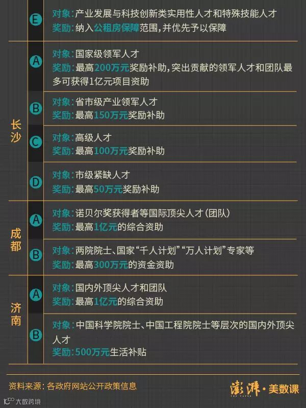 各地政府为了将人才收入囊中可谓是“痛下血本”,包括重庆、天津在内的6座城市规定了各类人才的奖励标准。其中,长沙、成都和济南对顶尖人才及团队的资金补助最高达到了1亿元。