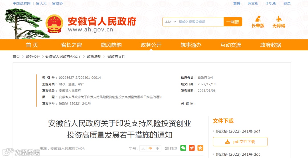 近日,安徽省人民政府印发《支持风险投资创业投资高质量发展的若干措施》。