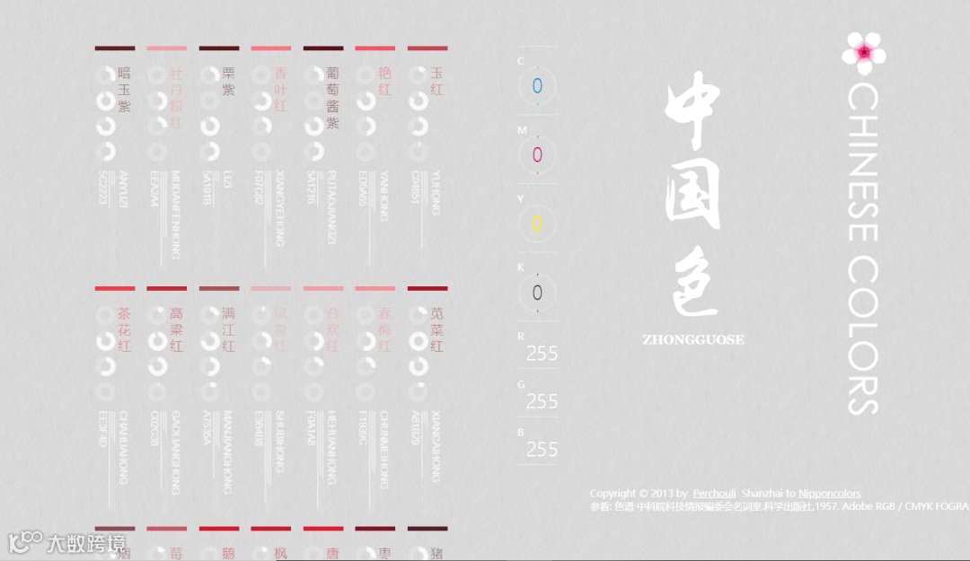 提供各种中国的传统颜色的名称,CMYK值,RGB值,16进制表示。