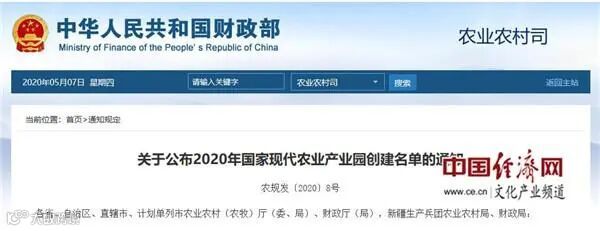 农业农村部、财政部公布2020年国家现代农业产业园创建名单。经遴选,批准