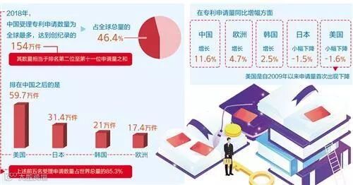显示,中国专利申请数量继续在全球领先。2018年,中国受理专利申请数量为全球最多,达到创纪录的154万件,占全球总量的46.4%,其数量相当于排名第二位至第十一位申请量之和。排在中国之后的是