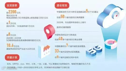 尽管拿到5G牌照的四大运营商,并没有悉数公布各自详细的5G投资、建设计划,但是,有关机构早已对5G投资以及对经济的带动作用进行了详细测算: