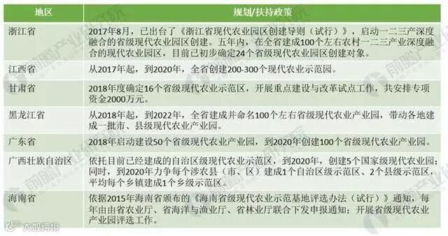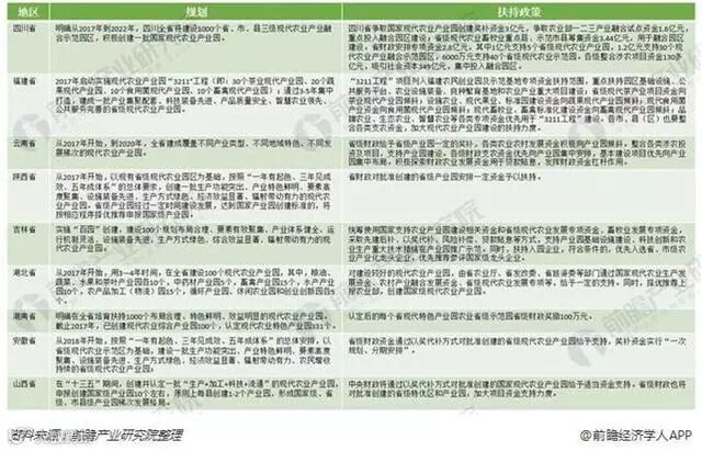 图表:2018年各省现代农业产业园规划及扶持政策汇总