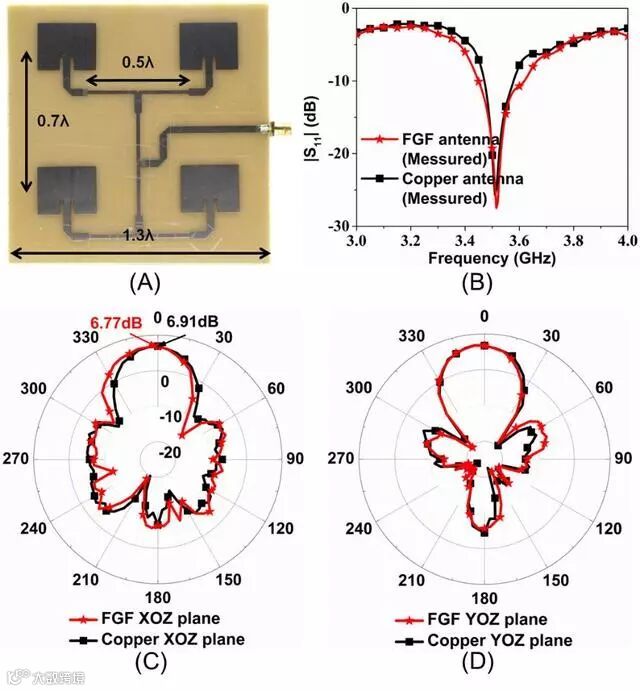 近期,武汉理工大学射频与微波研究中心何大平教授课题组制得了一种电导率高达106 S/m的自支撑石墨烯基薄膜,并将其应用在5G通信天线的设计中。利用高导电率的自支撑石墨烯薄膜设计并使用高精度激光雕刻法制备了一种工作频率在3.5 GHz的轻质微带天线阵列。该天线阵列具备优异的天线性能,增益为6.77 dBi, 反射系数为-20.23 dB,且具有跟铜天线类似的辐射方向图。
