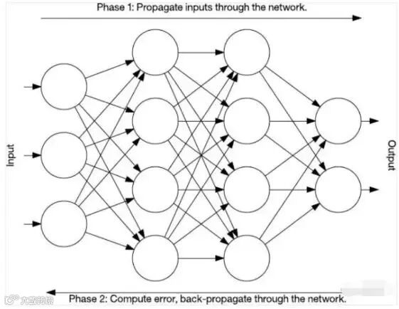 反向传播是一种用于训练多层神经网络的算法。它的工作过程分为两个阶段。第一阶段是将输入传播通过整个神经网络直到最后一层(称为前馈)。第二阶段,该算法会计算一个误差,然后从最后一层到第一层反向传播该误差(调整权重)。