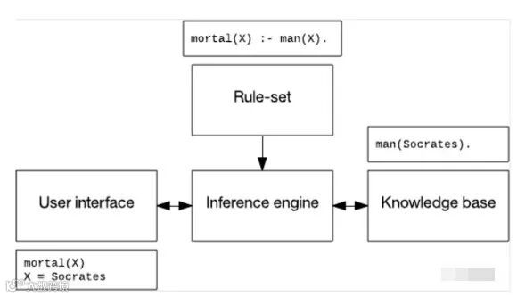 基于规则的系统通常由一个规则集合、一个知识库、一个推理引擎(使用前向或反向规则链)和一个用户接口组成。下图中,我使用了知识「苏格拉底是人」、规则「如果是人,就会死」以及一个交互「谁会死?」