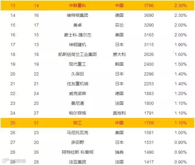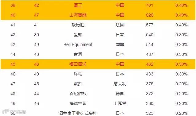 从全球工程机械制造商50强排行榜大名单上来看,中国的工程机械市场正在一步步向世界最高水平发展,前50强当中就包括了9家国内的企业,其中就包括了徐工(第6名)、三一(第8名)、中联重科(第13位)、柳工(第25位)、龙工(第30位)、山推(第33位)、厦工(第39位)、山河智能(第40位)、雷沃重工(第45位)。