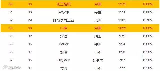 与2017年的前十强相比,前三位没有任何变化,沃尔沃建筑设备从去年第五位上升到第四,利勃海尔则下滑一位到第五位。杰西博JCB后来者居上从去年12位上升到第10位,而特雷克斯、山特维克则纷纷下滑两位,跌出了十强的位置。