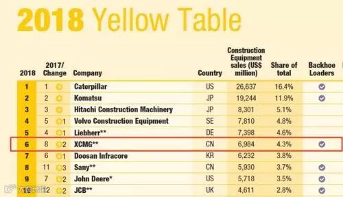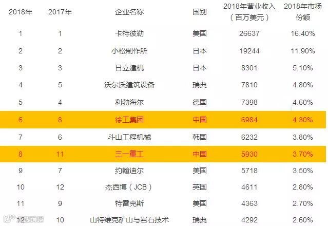2018年《全球工程机械制造商50强排行榜》,前10强的排名依次是卡特彼勒( Caterpillar)、小松(KOMATSU_)、日立(HITACHI)、沃尔沃建筑设备(Volvo Construction Equipment)、利勃海尔(Liebherr)、徐工(XCMG)、斗山(DOOSAN)、三一(SANY)、约翰迪尔(John Deere)、杰西博(JCB )。