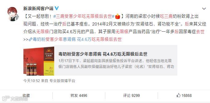 而微博又爆出,河南的梁宏小时候吃三鹿奶粉致肾上出现问题,经统一治疗后已基本痊愈。2014年2月又被确诊为“双肾结石、肾功能不全”。后来其父经介绍从无限极门店购买4.6万元的产品,其子服用无限极产品当药品“治疗”一年多后因尿毒症去世。