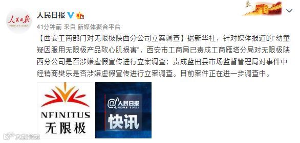 针对媒体报道的“幼童疑因服用无限极产品致心肌损害”,西安市工商局已责成工商雁塔分局对无限极陕西分公司是否涉嫌虚假宣传进行立案调查;责成蓝田县市场监督管理局对事件中经销商樊乐是否涉嫌虚假宣传进行立案调查。目前,案件正在进一步调查中。