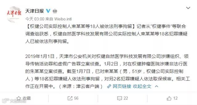 2019年1月1日,天津市公安机关对权健自然医学科技发展有限公司涉嫌组织、领导传销活动罪和虚假广告罪立案侦查。