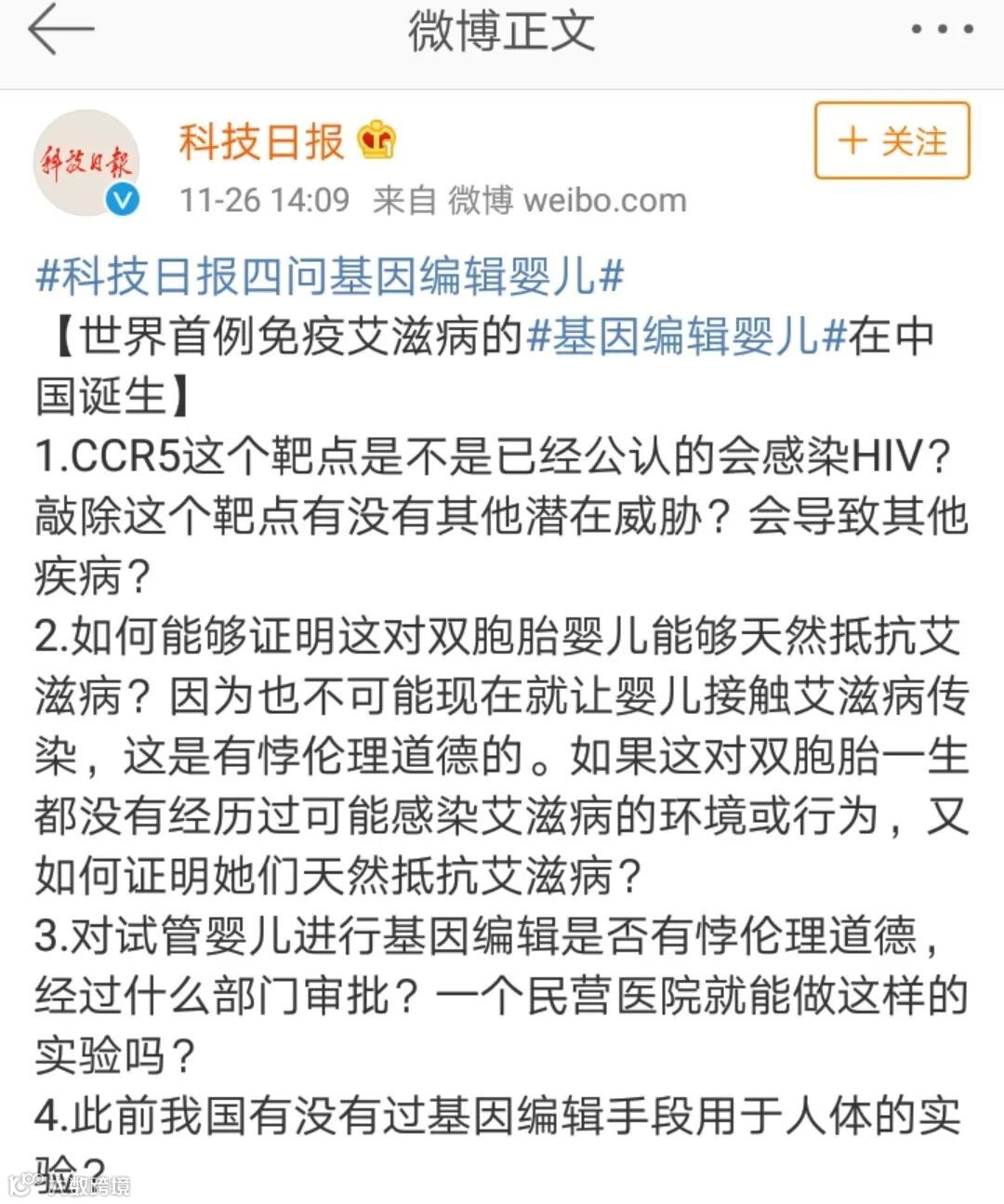 针对该问题,科技日报还发布了名为“四问基因编辑婴儿”的微博。
