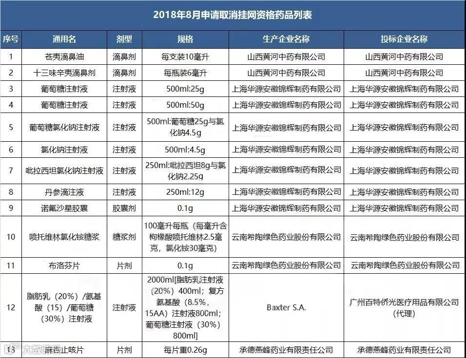 通知显示,2018年8月,由于原料上涨、生产线改造、环境污染等原因导致许多药品停止生产,山西黄河中药有限公司、上海华源安徽锦辉制药有限公司等5家药品生产企业(代理企业)申请取消13个药品挂网资格,并递交全国统一不供货承诺函。