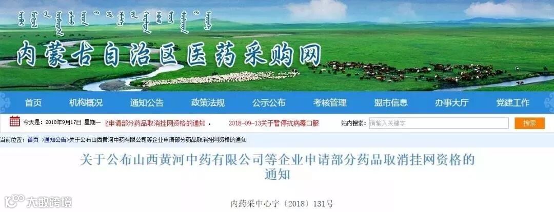 9月17日,内蒙古自治区药品器械集中采购服务中心公布了山西黄河中药有限公司等企业申请部分药品取消挂网资格的通知。