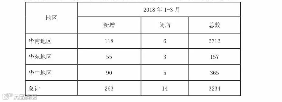 截至2018年3月31日,大参林拥有直营门店3234家,1-3月中新增门店263家,其中自建130家,收购门店133家,闭店14家,新增店以每天接近3家的数字在增长。