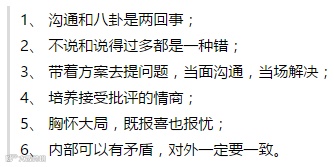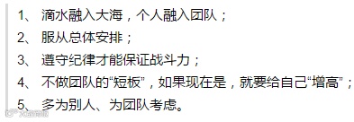 团队提前,自我退后。不管个人能力多强,只要伤害到团队,公司决不会让你久留——不要认为缺了你一个,团队就无法运转!