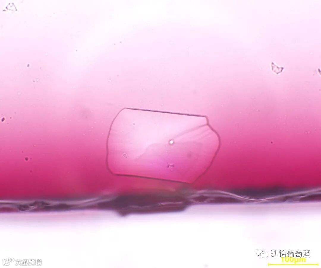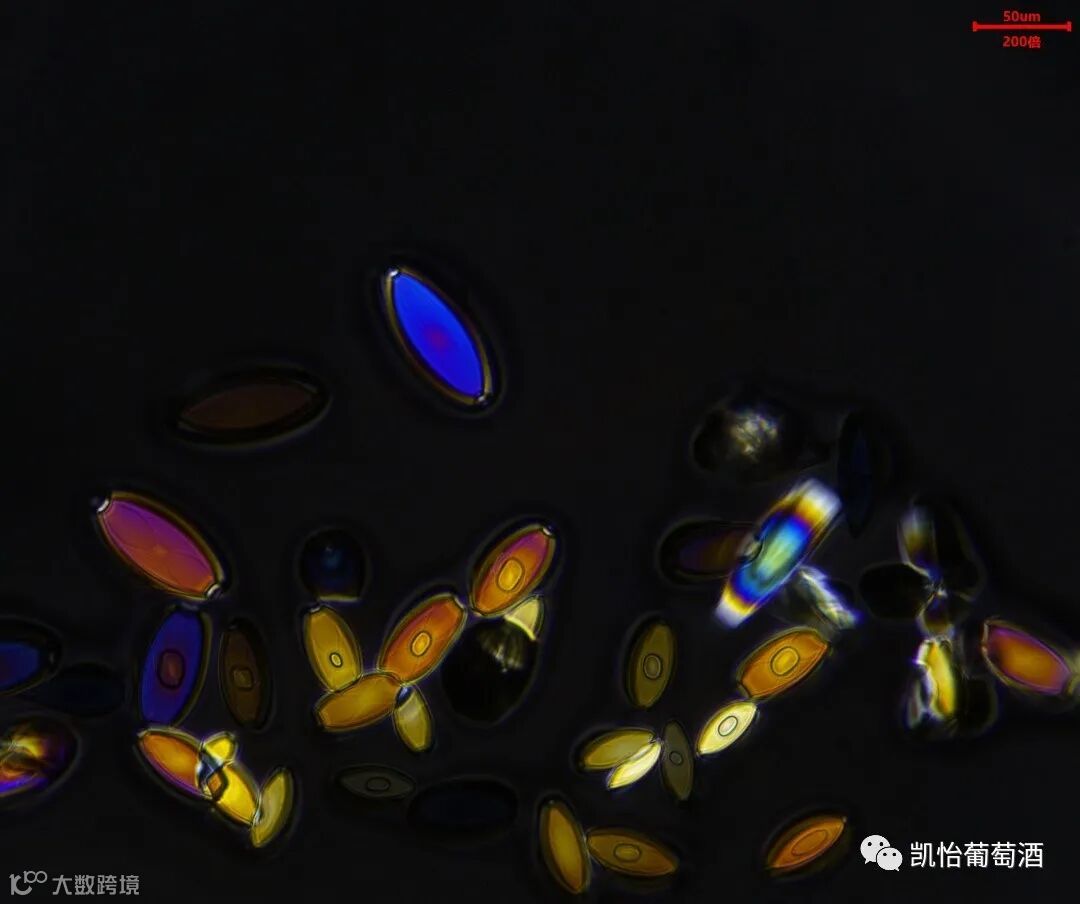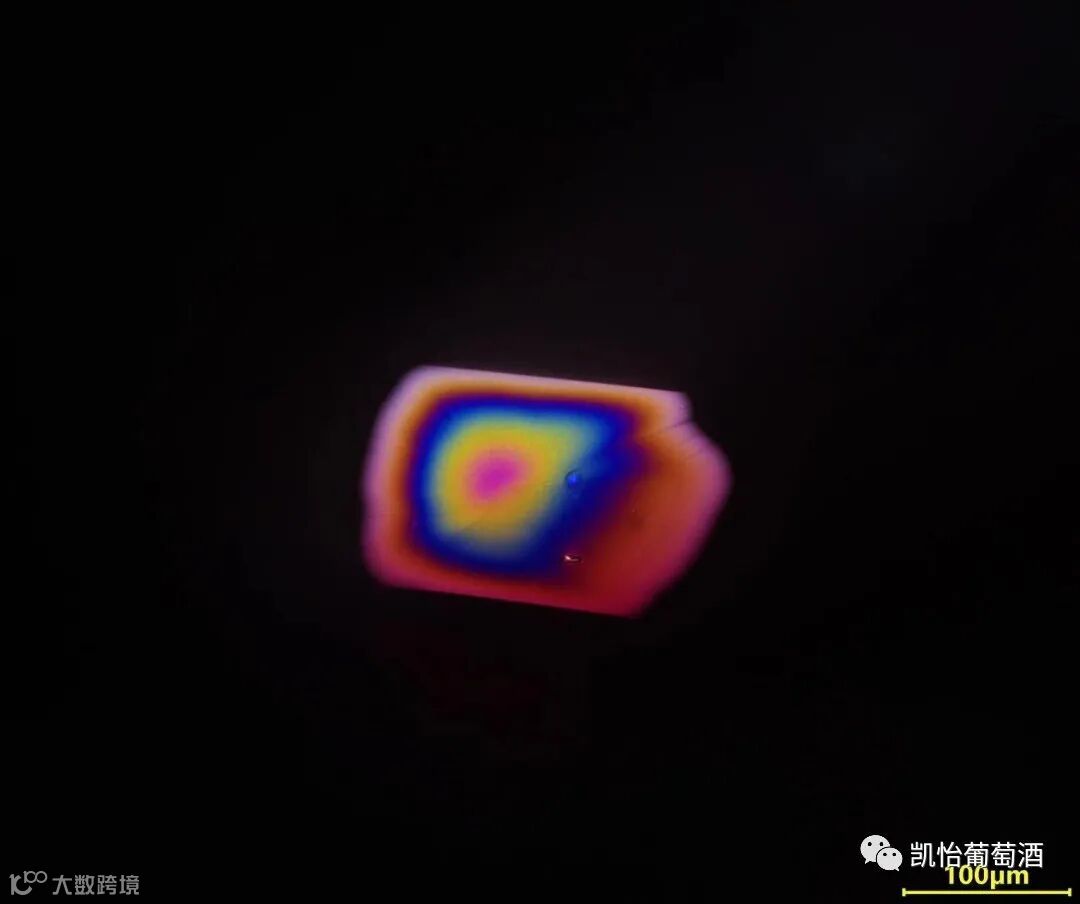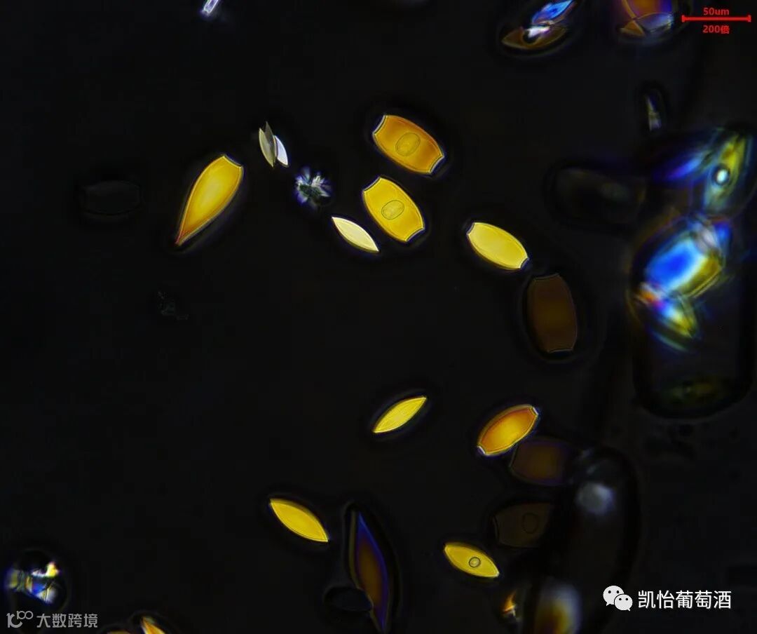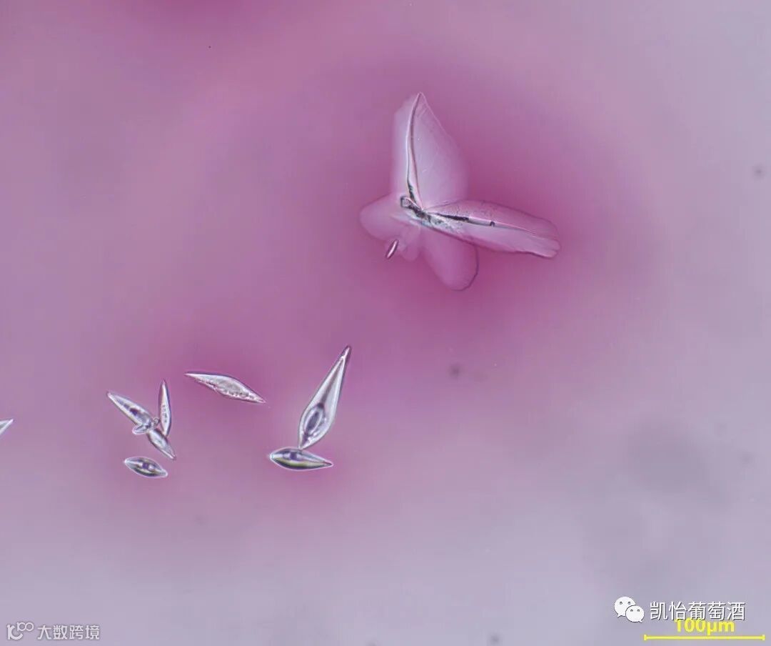 这些显微镜下的晶体好像一颗颗璀璨的宝石,研究人员分析这些晶体主要是酒石酸、酒石酸氢钾、酒石酸钾钠和一些单宁,在年轻的葡萄酒中找到这样的“宝石”,证明了葡萄酒里的矿物质含量特别高。