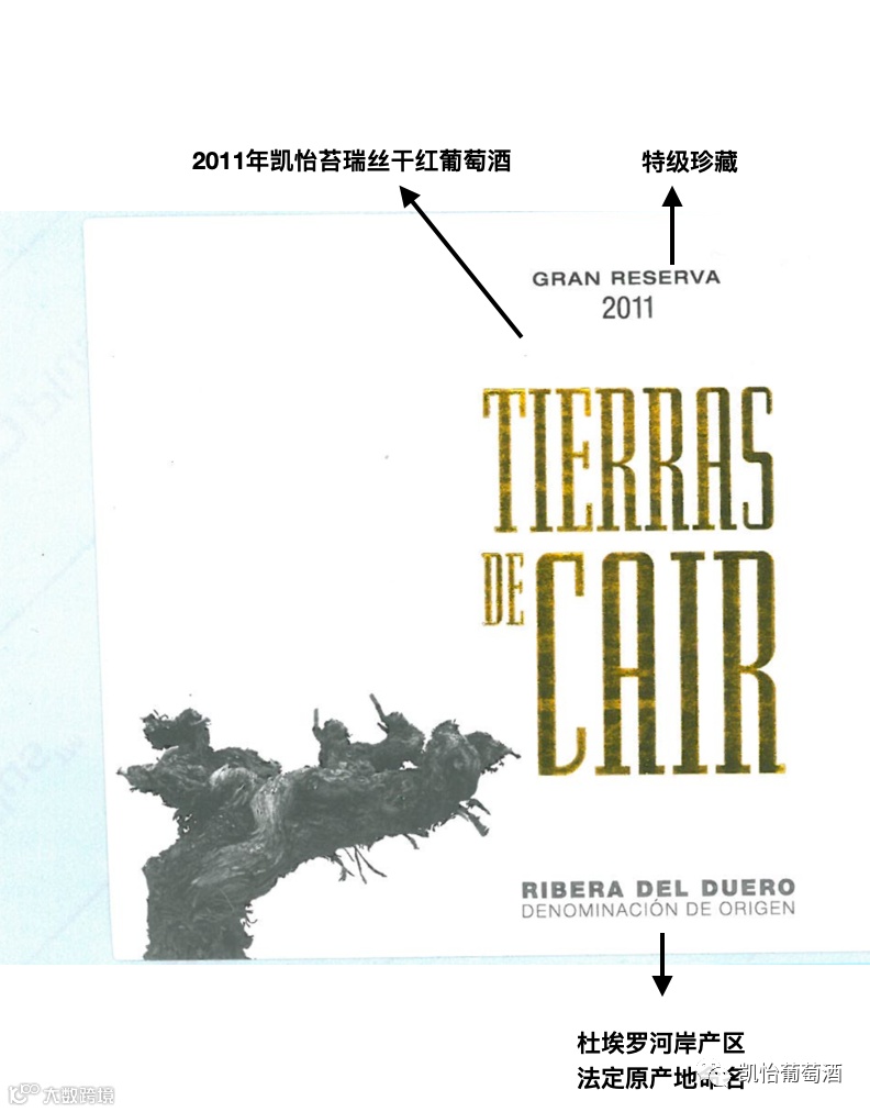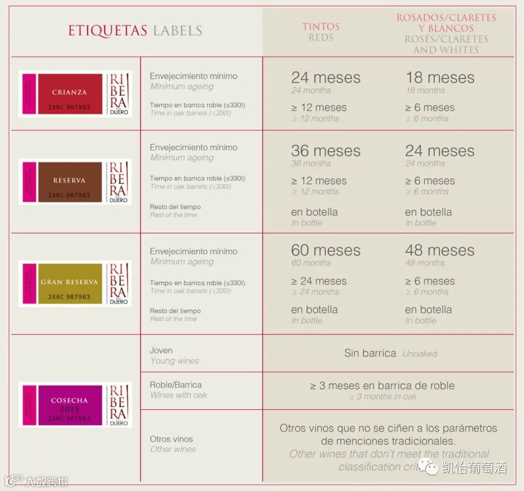 以上为凯怡酒庄所在产区杜埃罗河岸产区的陈酿等级标签,该分级标签表示葡萄酒的陈年时间,此等级适用于法定产区(DO)和保证法定产区(DOCa)级别的葡萄酒。之后每年由各产区管理委员会严格监督并且发放的。这两个级别的葡萄酒按陈年时间的长短分为采收酒(Cosecha)、陈酿(Crianza)、珍藏(Reserva)和特级珍藏(Gran Reserva)。特级珍藏级红葡萄酒的陈年时间为至少60个月,其中至少24个月在橡木桶中熟成;珍藏级红葡萄酒的陈年时间为至少36个月,其中至少12个月在橡木桶中熟成;陈酿级红葡萄酒的陈年时间为至少24个月,其中至少12个月在橡木桶中熟成。
