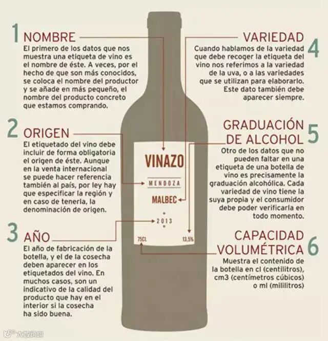 在拿到一瓶葡萄酒以后,酒标上面有很多信息是一目了然的,而读懂了上图的6点,我们就可以了解葡萄酒的基本信息: