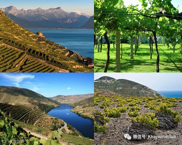 图为瑞士拉沃左上,西班牙加利西亚右上,葡萄牙波尔图左下,希腊圣托里尼岛右下