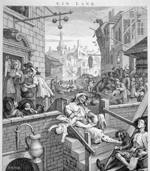 这幅蚀刻板画在1751年《金酒法令》(Gin Act)颁布后非常流行,是政府用来支持反金酒运动的宣传画。画中描绘了滥饮金酒给人民带来的后果,那就是可怕的贫穷、疯狂、罪恶还有死亡。在当时,金酒被认为是伦敦高犯罪率的主要原因。