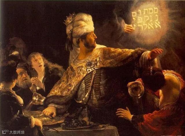 伦勃朗受到《旧约圣经》的启发,创造了《伯沙撒的盛宴》这幅作品。作品的主题是一场被突然打断的盛宴。在这场宴会上,正当巴比伦的国王伯沙撒和群臣们欢乐畅饮的时候,墙壁上突然冒出一片文字,警示巴比伦王国将最终走向灭亡。