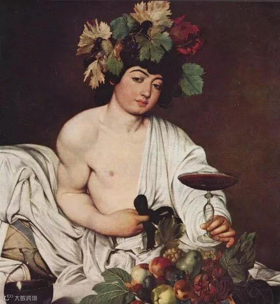 卡拉瓦乔把罗马的酒神巴克斯描摹成一位年轻的、容易脸红的男孩子。在他的这幅画中,巴克斯慵懒地向观众递出一杯葡萄酒,他的面前则摆着腐烂的水果和枯萎的花朵。画幅前方的醒酒器有着深刻的寓意反射,画界普遍认为这是一个艺术家的自画像。
